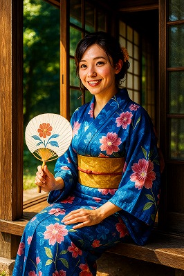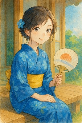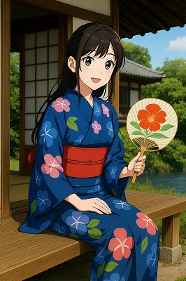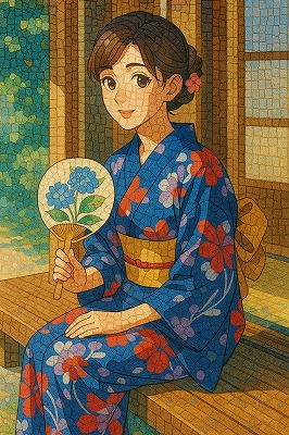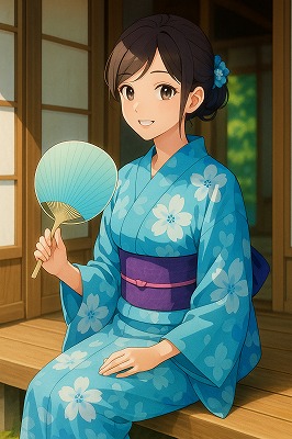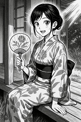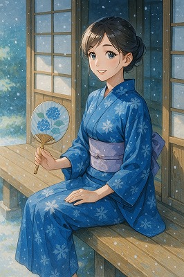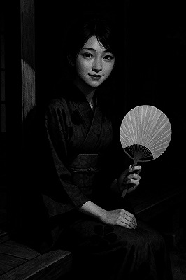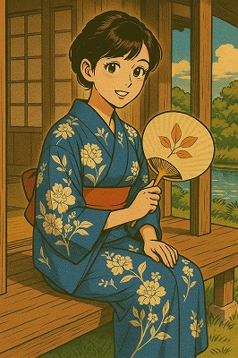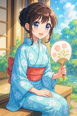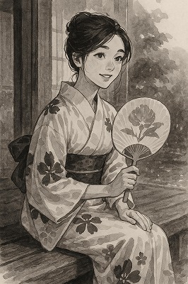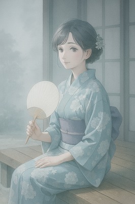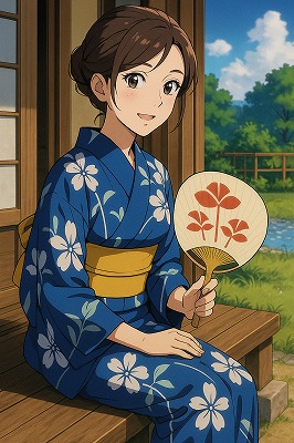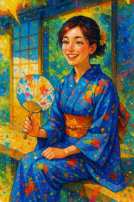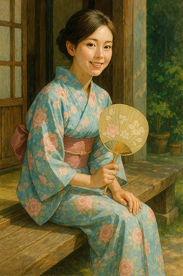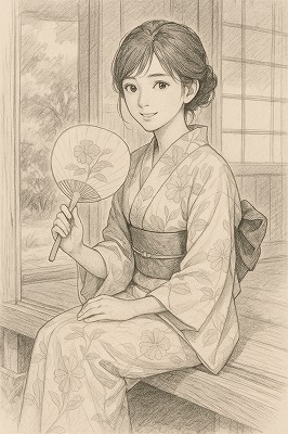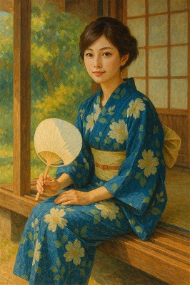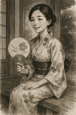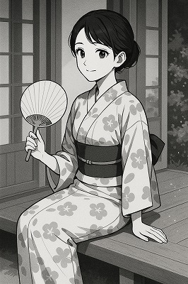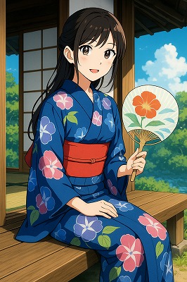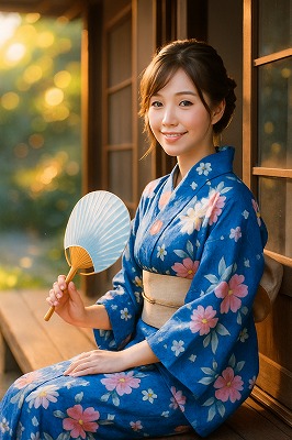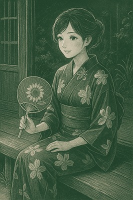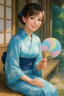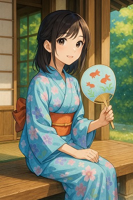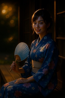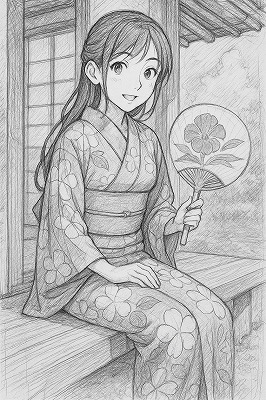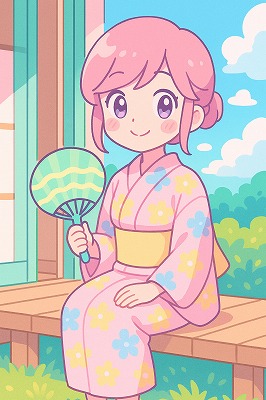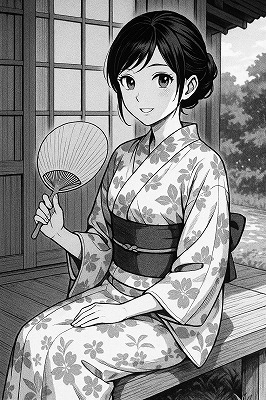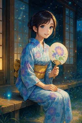 では、これらのイラストの具体例を見てみましょう。今回、「家の縁側で、浴衣で団扇を持っている女性」という設定で100種類生成しました。