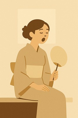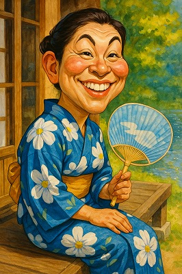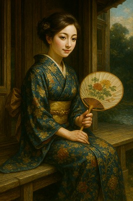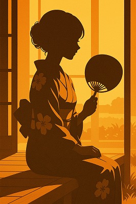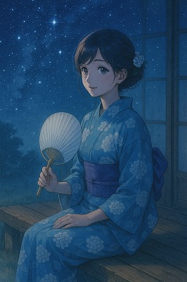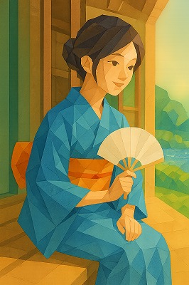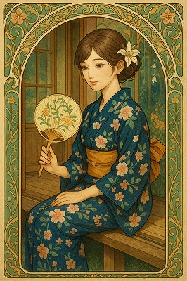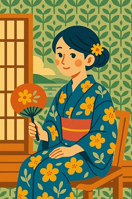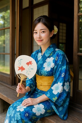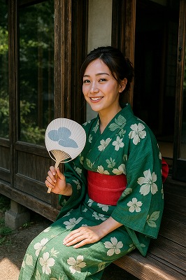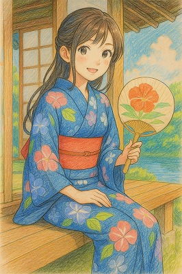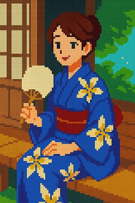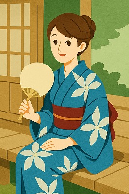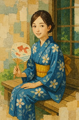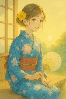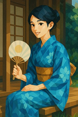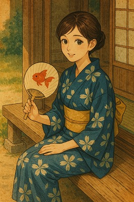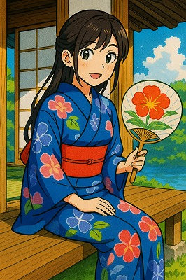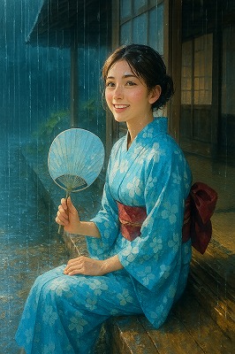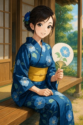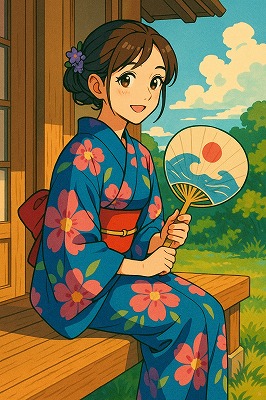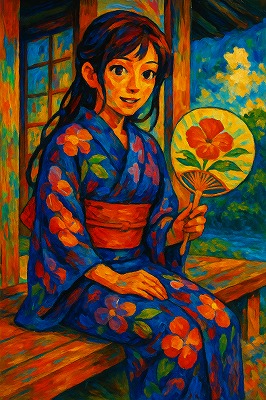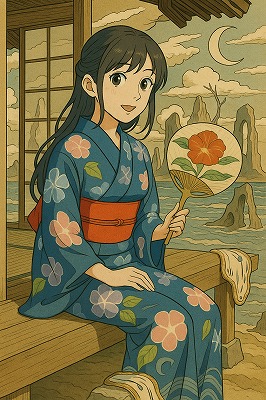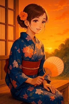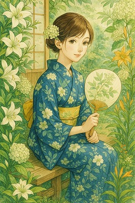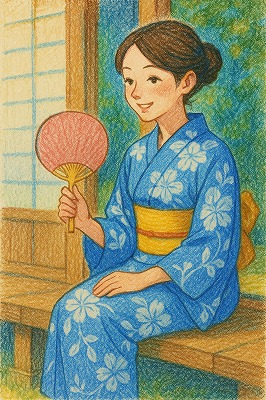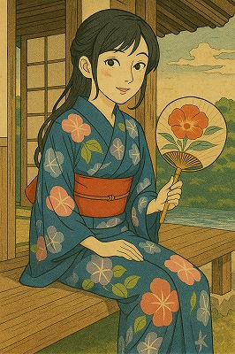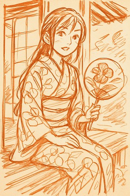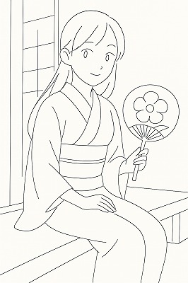 では、これらのイラストの具体例を見てみましょう。今回、「家の縁側で、浴衣で団扇を持っている女性」という設定で100種類生成しました。
